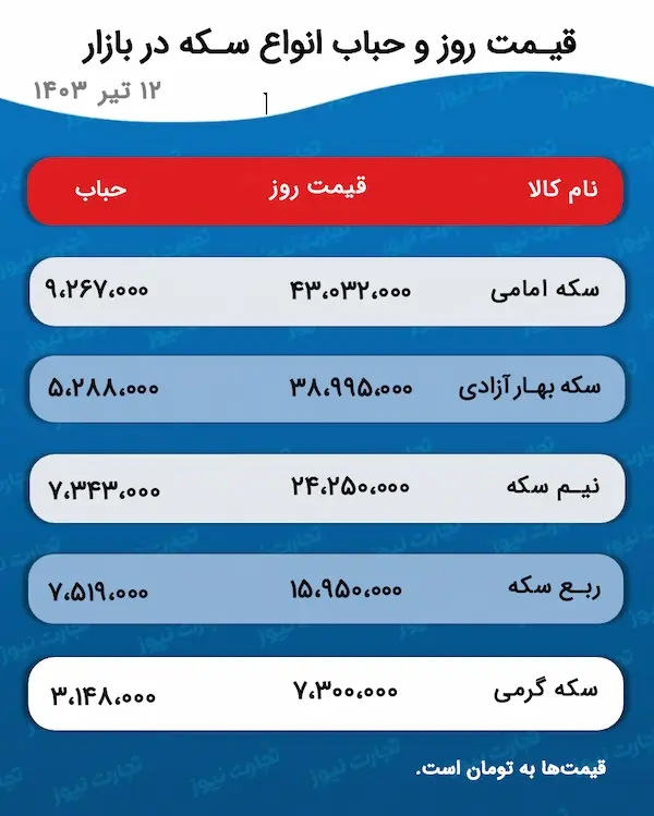 سکه امامی سه شنبه دوازدهم تیر با افزایش ۴۰۰ هزار تومانی مبلغ ۴۳ میلیون و ۳۲ هزار تومان معامله شد. سکه بهار نیز با ۷۰ هزار تومان افزایش ۳۸ میلیون و ۹۹۵ هزار تومان ارزش گذاری شد.