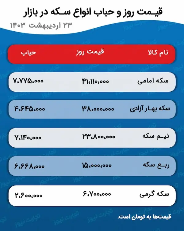 قیمت سکه امامی یکشنبه ۲۳ اردیبهشت با کاهش ۱۰۰ هزار تومانی ۴۱ میلیون و ۱۱۰ هزار تومان بسته شد. قیمت سکه بهار ۳۸ میلیون تومان معامله شد و ۵۰۰ هزار تومان کاهش را به ثبت رساند.