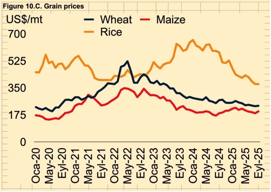 در این گزارش بانک جهانی آمده است: برنج شدیدترین اصلاح را نشان می دهد و در سال ۲۰۲۵ با ۳۱ درصد کاهش به ۴۰۶ دلار در هر تن رسیده و پس از آن تعدیل های جزئی در سال های ۲۰۲۶-۲۰۲۷ رخ می دهد. بانک جهانی به «عادی شدن پس از موجهای ناشی از آب و هوا و محدودیت های صادراتی در سال ۲۰۲۴» اشاره می کند. این گزارش نتیجه میگیرد که «قیمت جهانی کالاهای غذایی همچنان رو به کاهش است» و غلات به عنوان عامل اصلی این روند کاهش تورم عمل می کنند.