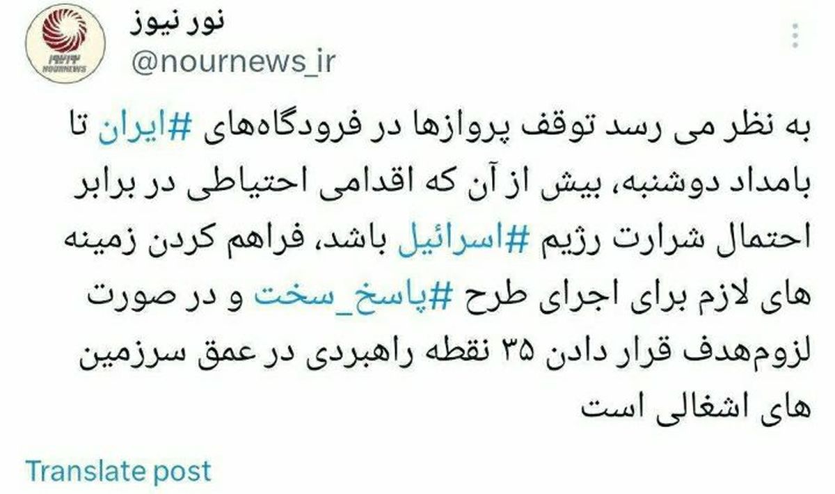 نورنیوز نوشت: به نظر می رسد توقف پروازهای فرودگاه های ایران تا بامداد دوشنبه بیش از یک اقدام پیشگیرانه در برابر احتمال شرارت رژیم اسرائیل، فراهم کردن زمینه های لازم برای اجرای طرح واکنش سخت و در صورت لزوم، هدف قرار دادن ۳۵ یک نقطه استراتژیک در عمق سرزمین های اشغالی است.