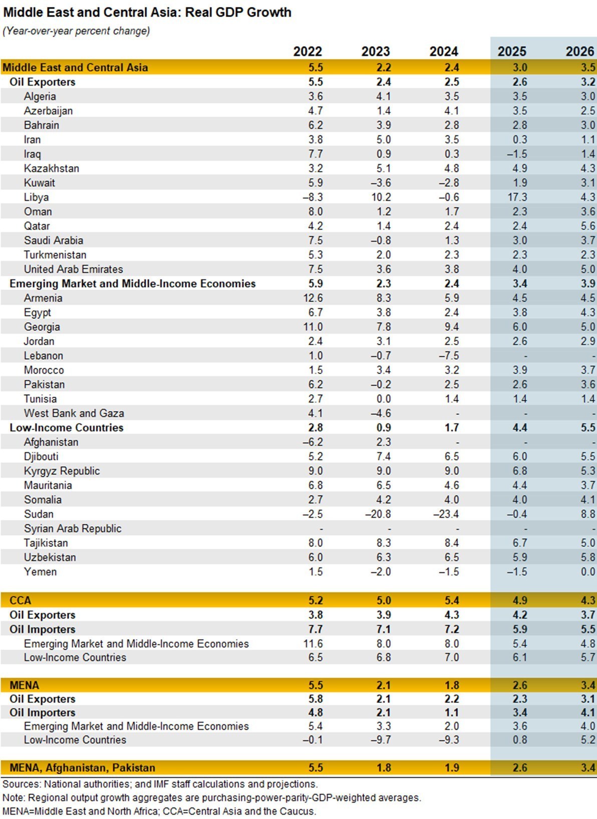 صندوق بین المللی پول رشد خاورمیانه و شمال آفریقا (MENA) را برای ۳ ٪ برای سال ۲۰۲۵ پیش بینی می کند. این تعداد در اکتبر ۲۰۲۴ در مقایسه با پیش بینی انتشار قبلی کاهش یافته است. رشد اقتصادی منطقه در سال ۲۰۲۶ نیز حدود ۳.۵ درصد خواهد بود.
