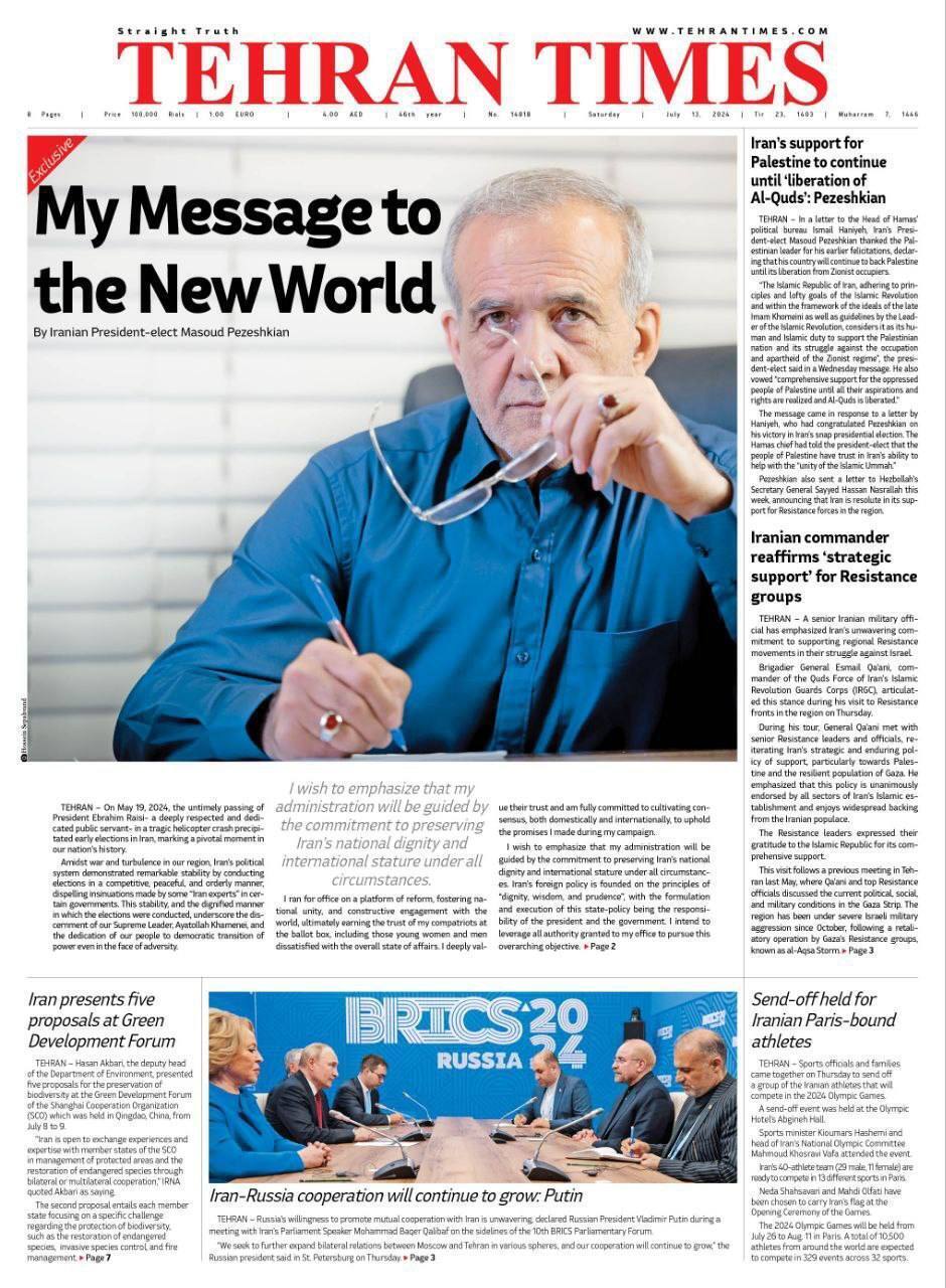 یادداشت مسعود بیزیکیان رئیس جمهور منتخب درباره نگاهش به روابط با کشورهای منطقه، آفریقا، چین، روسیه، اروپا و آمریکا در شماره جدید این روزنامه منتشر شده است.