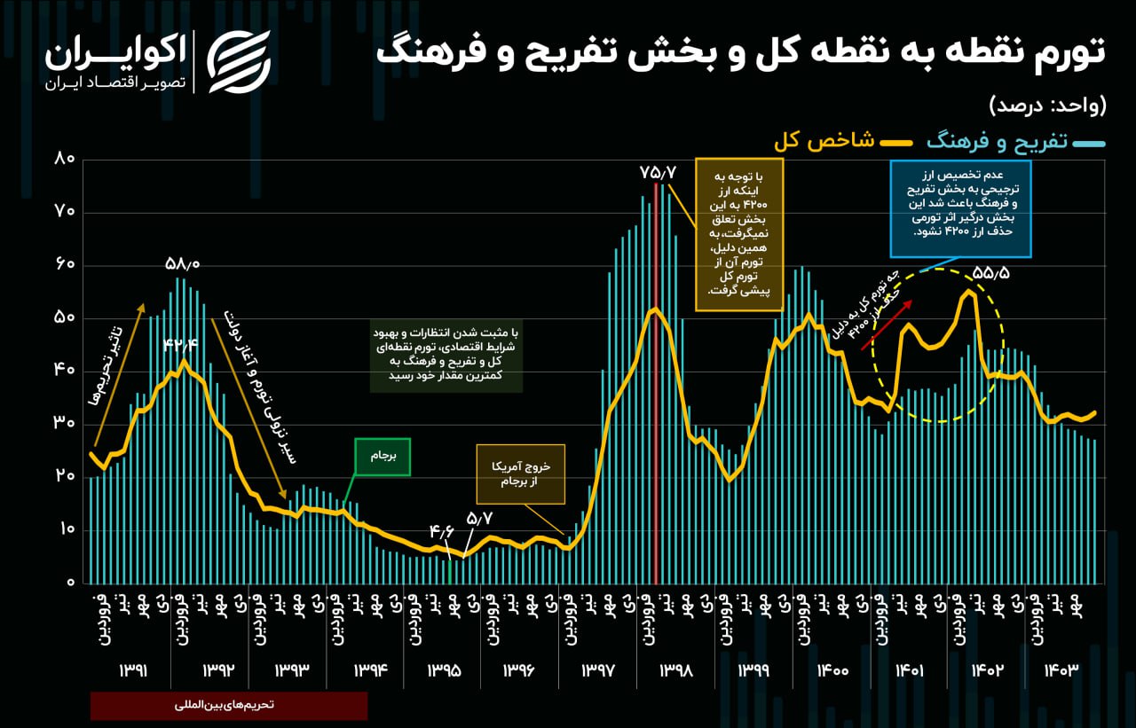 در ابتدای سال ۱۴۰۱ دولت سیزدهم تصمیم به حذف ارز ترجیحی گرفت و این تصمیم تورم کشور را بیش از پیش مواج کرد. البته از آنجایی که ۴۲۰۰ ارز به حوزه تفریحی و فرهنگی اختصاص داده نشده است، این بخش از اثر تورمی حذف ۴۲۰۰ ارز مصون است. اما تورم کل نقطه ای بالا رفت و وارد شد فروردین ۱۴۰۲ به اوج خود در ۵۵.۵٪ رسید. به همین دلیل، روند تورم نقطهای کل و بخش تفریحی و فرهنگی در سالهای ۱۴۰۱ و اوایل سال ۱۴۰۲ همسو نیست. از ابتدای سال ۱۴۰۳ تا پایان آبن می توان شاهد روند افزایشی تورم کل نقطه ای بود. این در حالی است که تورم نقطه ای گروه سرگرمی و فرهنگ در این مدت سیر نزولی داشته است.