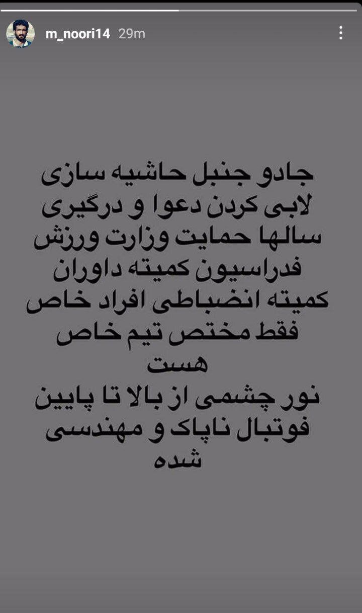 چندی پیش نمادهای جادوگری در رختکن پرسپولیس در ورزشگاه فولادشهر پیدا شد که خشم بازیکنان این تیم را برانگیخت و آنها قبل از بازی با ذوب آهن نسبت به این اتفاق موضع گیری شدیدی کردند. نوری در استوری خود شوخی های تندی با پرسپولیس کرد.