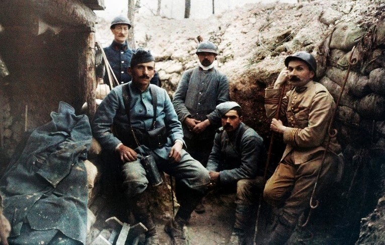 تصویر اتوکروم مربوط به سال ۱۹۱۵ که سربازان فرانسوی را در سنگر با لباسهای آبی و خاکی نشان میدهد. عکس از Jean-Baptiste Tournasaud