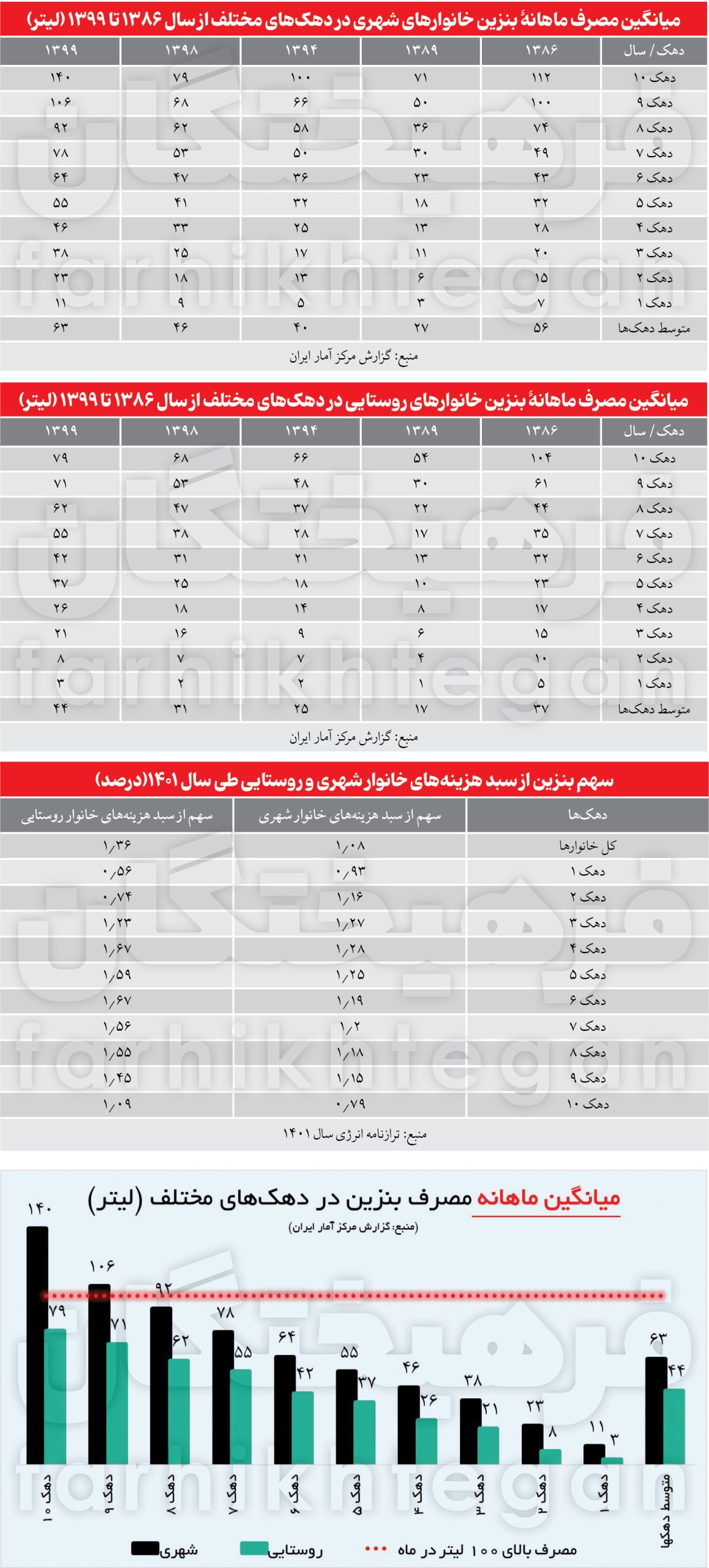 بر اساس گزارش مرکز آمار ایران، میانگین مصرف بنزین ماهانه خانوارهای شهری در سالهای ۱۳۸۵ تا ۱۳۹۸ روند افزایشی و متفاوتی در دهکهای درآمدی داشته است. میانگین مصرف خانوارهای شهری در همه دهک ها از ۵۶ لیتر در سال ۱۳۸۵ به ۶۳ لیتر در سال ۱۳۹۸ رسیده است که البته این رشد در دهک های پردرآمد بسیار قوی تر بوده است. دهک دهم پردرآمدترین خانوارها در سال ۱۳۸۵ با ۱۱۲ لیتر مصرف ماهانه به ۱۴۰ لیتر در سال ۱۳۹۸ رسیده است و علیرغم افت مصرف در برخی سال ها مانند سال ۱۳۸۸ (۷۱ لیتر) به دلیل طرح هدفمندی یارانه ها و سال ۱۳۹۸ (۷۹ لیتر)، در نهایت بیشترین میزان مصرف را به ثبت رسانده است.