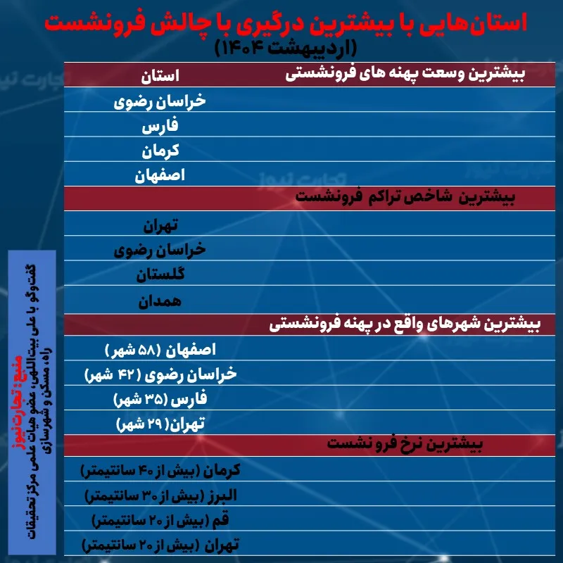 پدیده پایین آمدن ۳۰ استان کشور را بلعید و تنها تا به امروز گیلان یقین داشت که این چالش قطعی است ، اما برخی از استان ها بسیار مهم هستند. علی بیت اللهی ، عضو هیئت علمی مرکز تحقیقات جاده ، مسکن و توسعه شهری ، در مصاحبه ای با اخبار تجاری گفت که چهار استان سالانه بیش از ۱۰ سانتی متر در سال کاهش می یابد و این پدیده خطرات جدی برای محیط زیست کشور و زیرساخت های اساسی دارد.